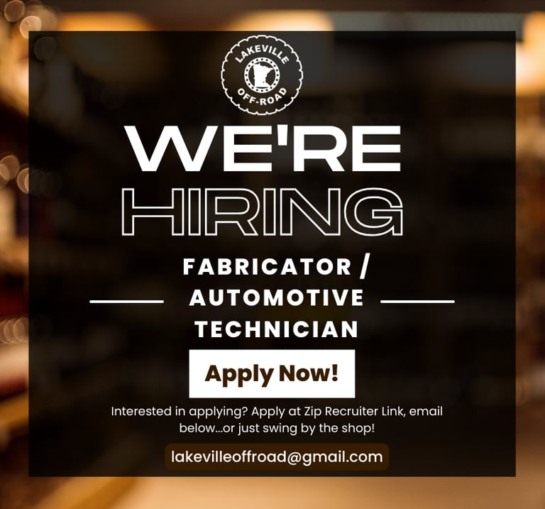 Are you passionate about Off-Road vehicles? Are you ready to tackle exciting new challenges every day? Join our fast-growing and bustling off-road vehicle shop in Lakeville, MN, where we specialize in crafting rugged Jeeps, buggies and anything off-road for ultimate adventures. We don’t just do work—we do the fun stuff!
